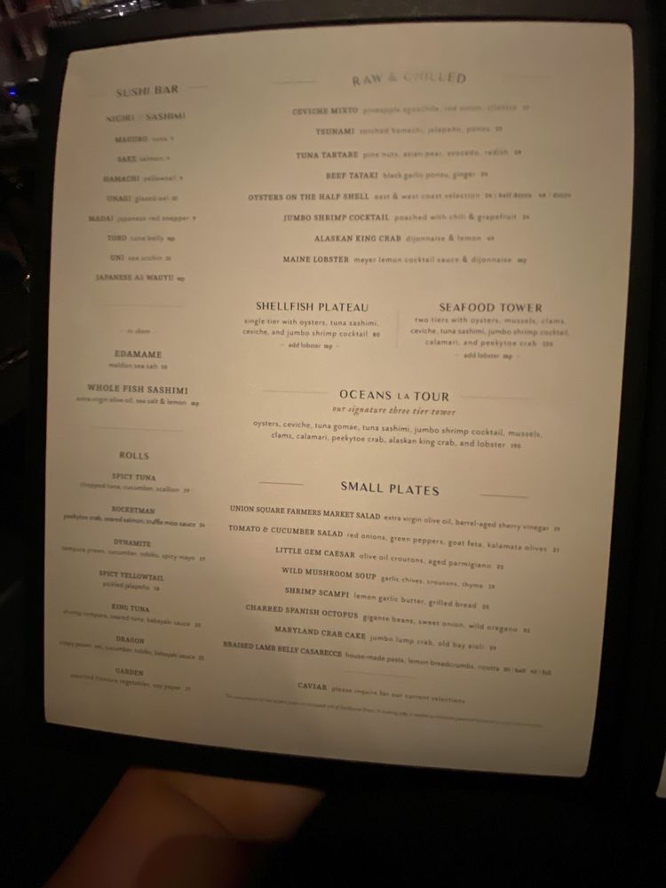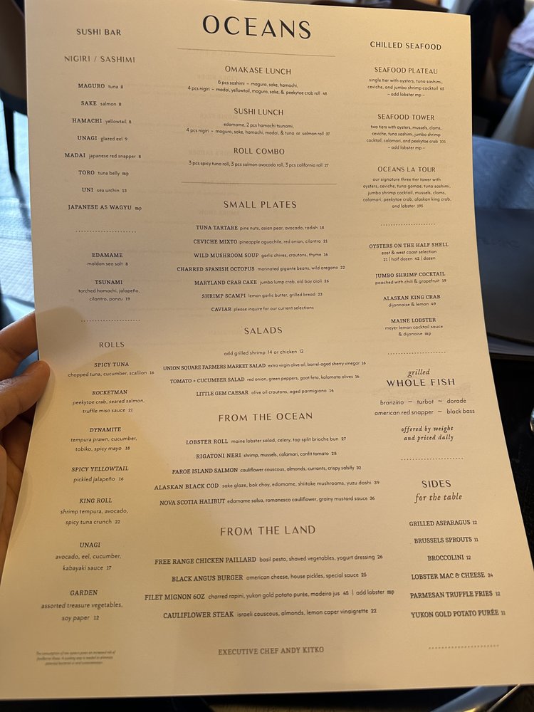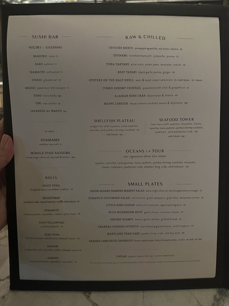 Introducing the menu at Oceans New York, a sophisticated seafood restaurant located at 233 Park Ave S in New York. This upscale establishment offers a variety of exquisite dishes, including Japanese A5 Wagyu Nigiri, Toro Tuna belly, and Uni Sea urchin. The sushi selection features creative rolls like the Spicy Tuna Roll and Garden Roll. For those looking for raw and chilled options, the Black Kaluga Caviar and Tsunami torched hamachi are must-tries. The ambiance is elegant and spacious, perfect for a special dinner or date night. Customers rave about the delicious food, attentive service, and wheelchair accessibility. Overall, Oceans New York is a hidden gem in the city, offering top-notch seafood and a memorable dining experience.